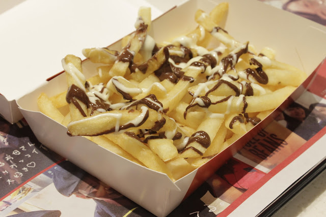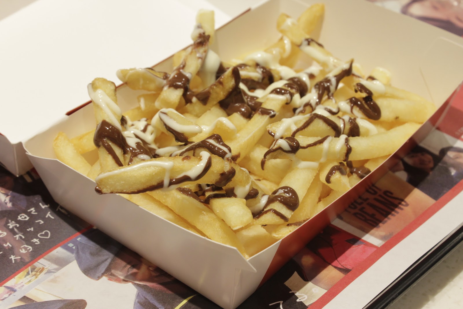 吃完之後走回飯店,看到了當時日本麥當勞剛推出的"巧克力奶油醬薯條"!